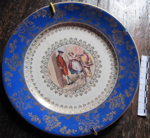 - Prato en louza de "San Claudio" que representa a unha parella vestida á moda do último terzo do XVIII, nunha típica de escena de cortexo, de casacón, con certa picaresca. Con cenefa en azul e motivos florais en dourado.