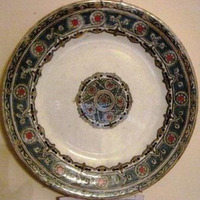 - Prato chan en louza de pedernal, de cor branco con cenefa e na parte central con debuxos xeométrico florais semellando traballo de musivaria en tons verdes, negros e dourados.