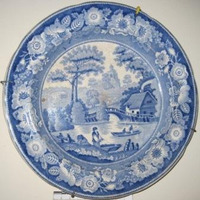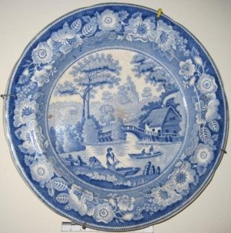 - Prato Chan en louza inglesa decorado con orla con motivos florais de rosas selvaxes (wild rose) e unha paisaxe inglesa de Nunehan country, en Oxfordshire, todo en cores brancos e azuis.