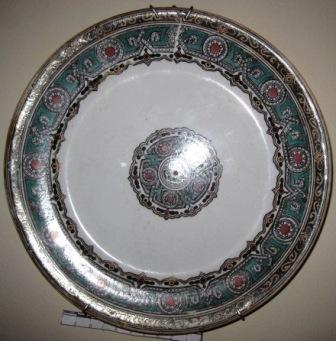 - Prato chan en louza de pedernal, de cor branco con cenefa e, na parte central, debuxos en forma de mosaico imitando motivos de ataurique en tons verdes, negros e dourados.