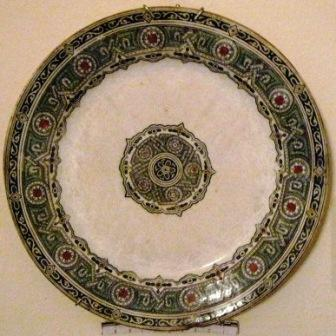 - Prato chan en louza de pedernal, de cor branco con cenefa e, na parte central, debuxos en forma de mosaico imitando motivos de ataurique en tons verdes, negros e dourados.