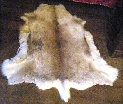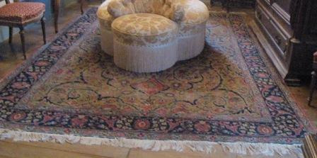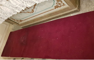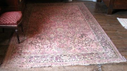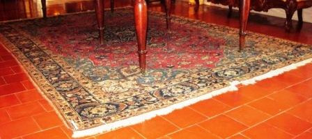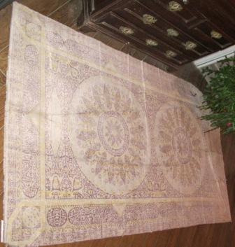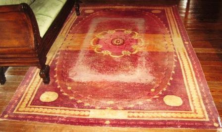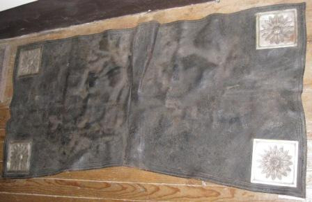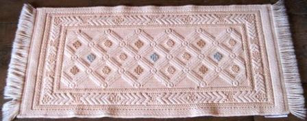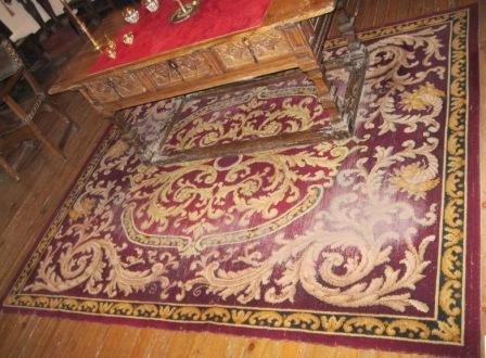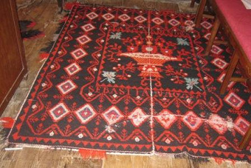 Alfombra realizada en tear con liño e lá con motivos xeométricos en tons negros, branco , azul e verde. Na parte central un floreiro e o nome das autoras: "Clara Cardenosa e Sebastiana García". Rematada en flecos. Quizais provinte do taller de "El Bodón", na provincia de Salamanca, pois facían alí alfombras artesanais deste tipo.