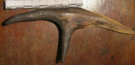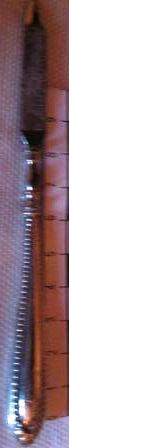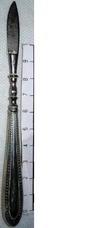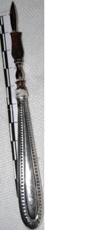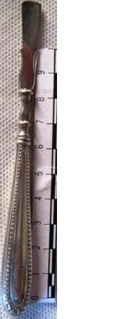 Agulla alfiliforme tallada en óso de balea con ollo para enliñar lá para faceren roupa de crianza. Posíbel traballo artesanal mariñeiro orixinario do porto baleeiro de Nantucket.